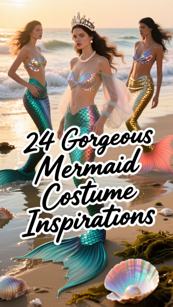 Shimmer your way into Halloween with a classic iridescent mermaid tail that’ll catch every light in the room. I’ve found that iridescent fabrics create that coveted underwater glow, transforming you into an enchanting sea creature. The shimmering scales reflect light beautifully, giving you an ethereal quality that’ll make you stand out.